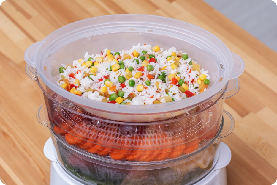 На трёх ярусах можно готовить одновременно несколько блюд, в дне каждого лотка расположены углубления для варки яиц. В комплекте есть чаша для варки риса и супа объёмом 1,2 литра. В поддоне с чистой водой расположен отсек для специй, он насыщает пар ароматами, а сам поддон при этом остаётся чистым.
